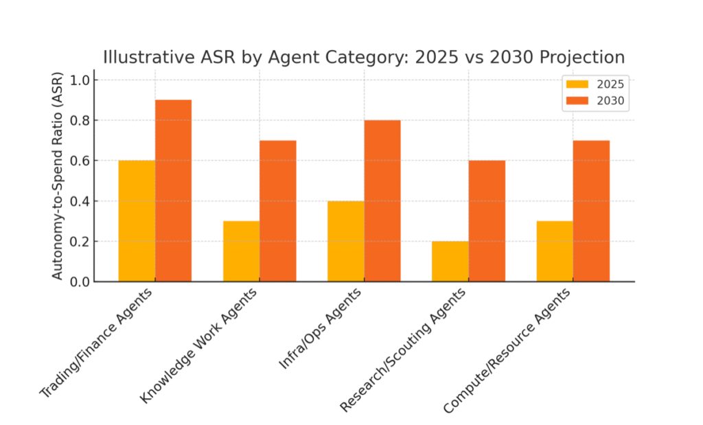 Figure 1: Illustrative Autonomy-to-Spend Ratio (ASR) across different agent categories, now vs. projected future. Each category’s ASR is expected to increase as agents become more capable and trusted, moving from reactive or semi-autonomous levels toward high autonomy by 2030. (Values are hypothetical for scenario illustration.)